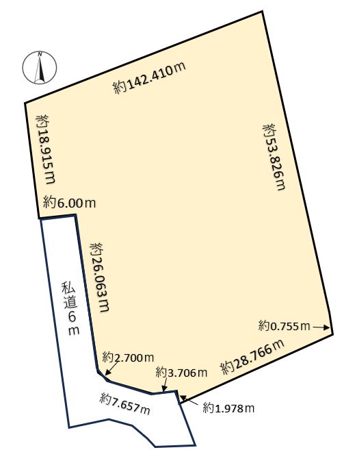 | 接道状況 | 西側 私道幅6mに約42.104m接する 南側 私道6mに約6m接する | ||